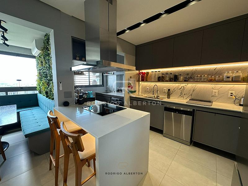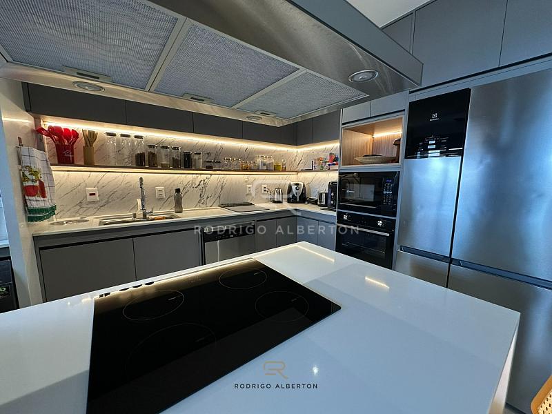 • Cozinha com ilha gourmet, equipada com armários planejados de alto padrão
